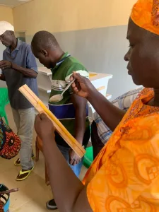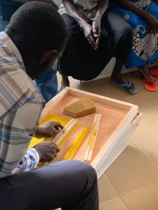 Hemos dado comienzo a las formaciones en apicultura en los pueblos de Bandial, una actividad con una larga tradición en la región de Casamance. Históricamente, la apicultura se realizaba mediante el uso de troncos de palmera ahuecados, que se untaban con azúcar o miel para atraer a las abejas. Sin embargo, este método resulta poco eficiente y conlleva una elevada mortandad de abejas, además de realizarse sin medidas adecuadas de seguridad.