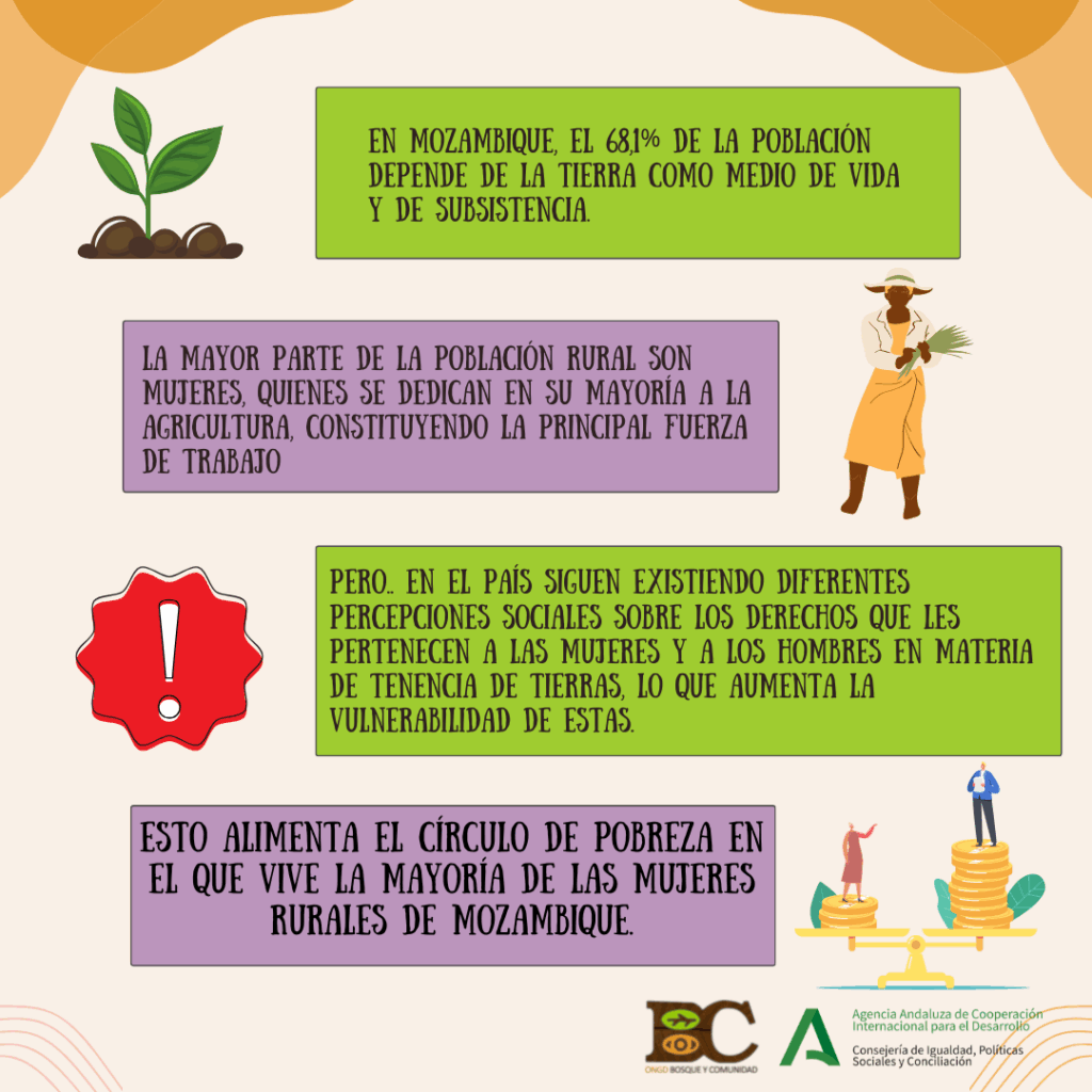 “Metodología para la inclusión de la equidad de género en la implementación de la legislación relativa a la tenencia de la tierra en comunidades rurales de las provincias de Gaza y Maputo en Mozambique” es un proyecto que parte de una de las problemáticas con las cuales, desde Bosque y Comunidad, estamos obligadas a enfrentarnos a menudo: el acceso a la tierra y su directa relación con la igualdad de género en el país.