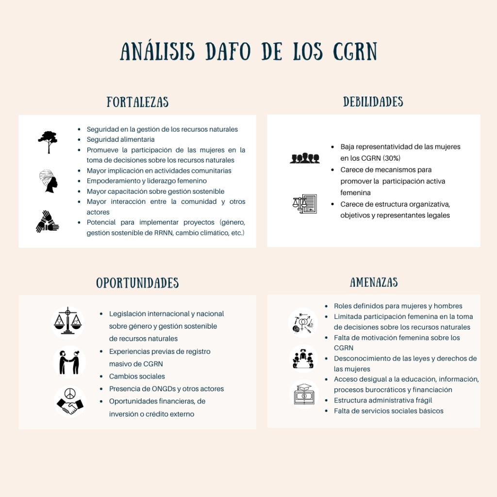 El análisis DAFO de los Comités de Gestión comunitaria de los Recursos Naturales (CGRN) con comunidades rurales del sur de Mozambique ha revelado los aspectos internos (fortalezas y debilidades) y externos (oportunidades y amenazas), tanto positivos como negativos, que contribuyen a avanzar en la equidad de género en la tenencia de los recursos naturales o, por el contrario, suponen un obstáculo.